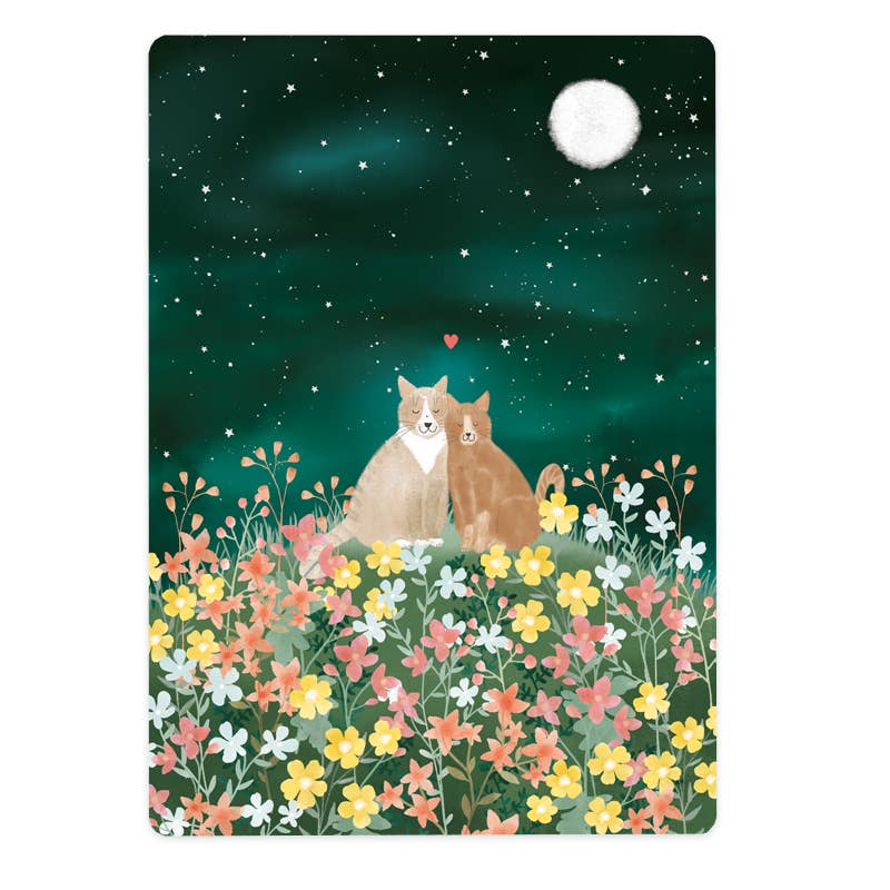 card two cats in love Printed on 270 gram Environment Birch paper: off-white paper with a small fiber in it. Environment Birch is FSC certified and is produced without the use of optical brighteners such as chlorine and consists of at least 30% post-consumer recycled fibers. With subtly rounded edges. Size of the card is A6 (105x148mm) As always, the back features some details from the illustration plus the logo of The Lemonbird, otherwise the back is blank.