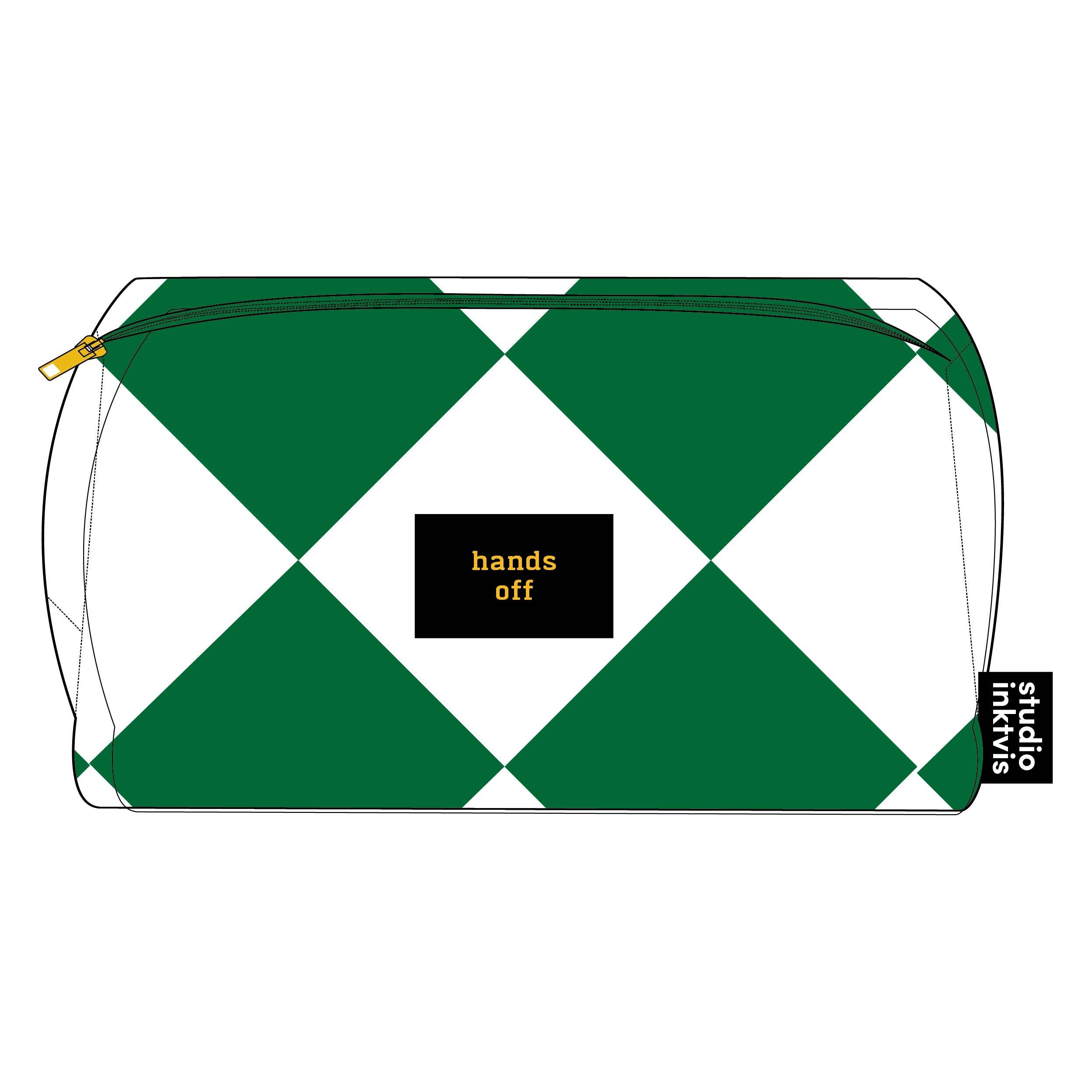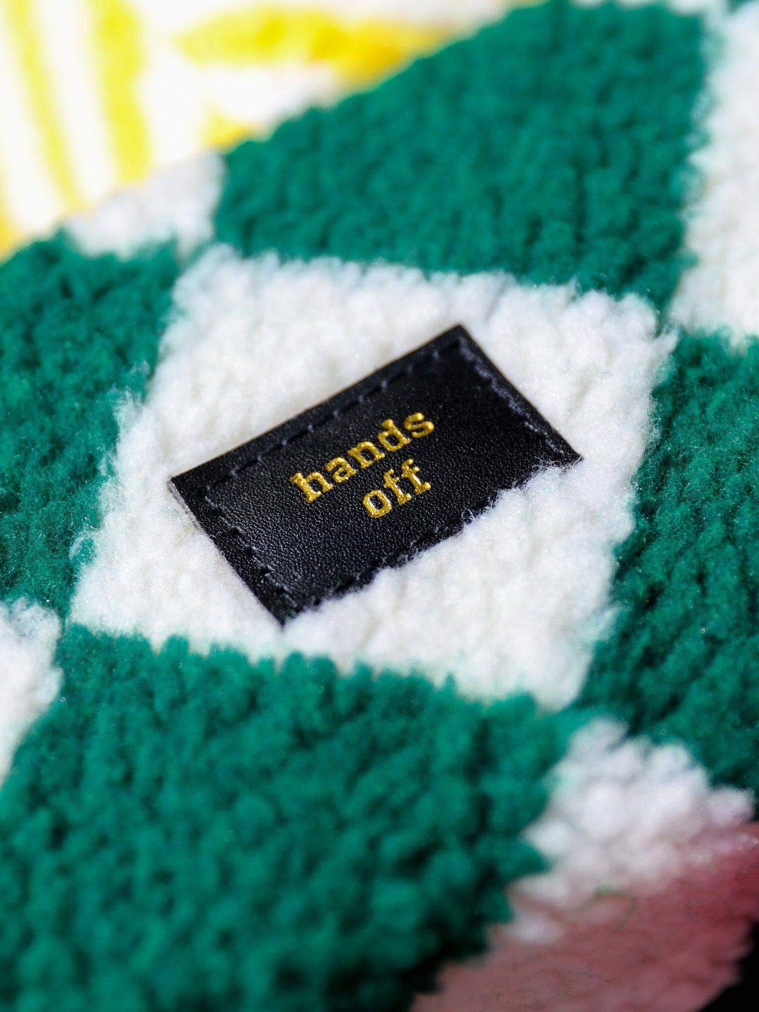 This medium green bag, with a striking diamond print and the quote "HANDS OFF" in gold letters, is made of soft teddy material, ideal as a bag-in-bag solution!
