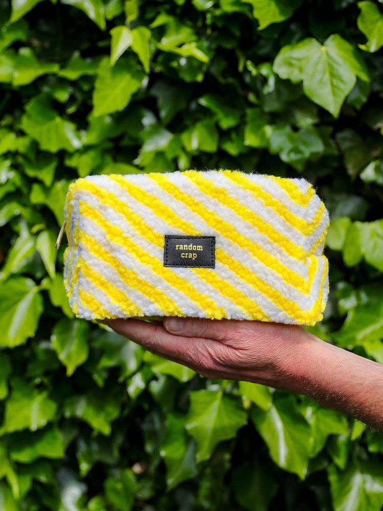This medium yellow and white bag, with a striking stripe print and the quote "Random crap" in gold letters, is made of soft teddy material, ideal as a bag-in-bag solution!